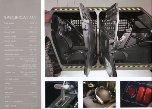 Que tiemble el Hummer. Alanqa Motor Company, empresa afincada en los Emiratos Arabes Unidos, presentará en el Salón del Automóvil de Dubai dos supertodoterrenos que estarán destinados cualquier particular que esté dispuesto a pagar por ellos, aunque por su aspecto diría que su principal mercado va a ser el militar. Impulsados por el descomunal motor V8 de 7.4 litros y 620 CV que da vida al mítico Corvette, si yo tuviera el suficiente dinero no dudaba en adquirir esta mezcla de caza de combate con tanque, no hay nada parecido en el mercado.