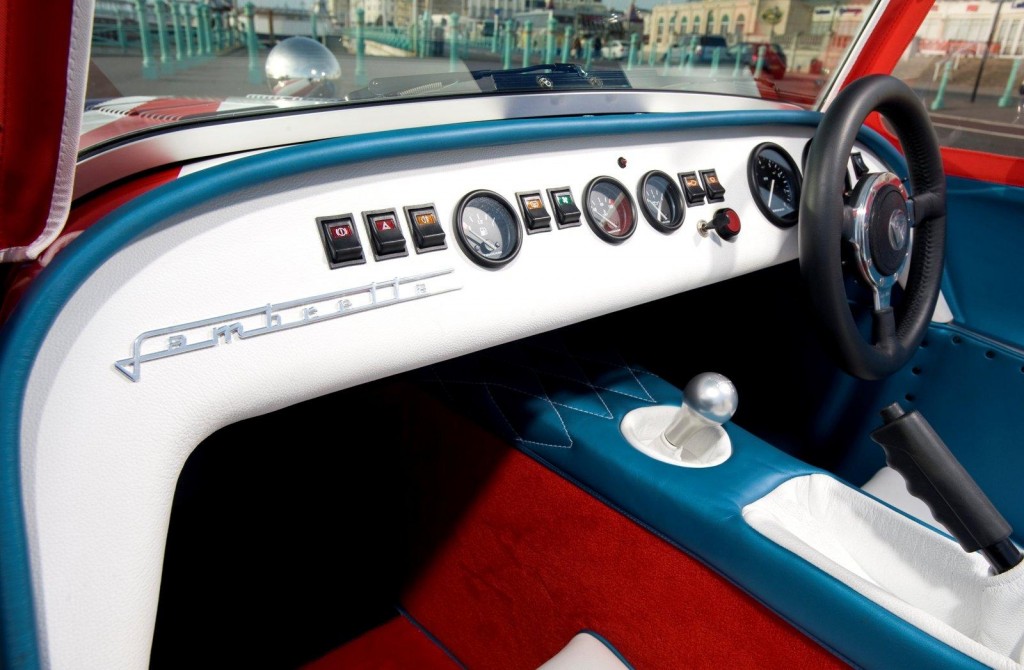 Toda su carrocería, incluido el interior, está estratégicamente pintada con los colores de la bandera del Reino Unido, llevando al extremo esa seña tan característica de los techos de los Minis más puristas. El tapizado de los asientos y la piel que cubre el túnel central están fabricados a mano y llevan impresos diversos motivos de Lambretta, lo que unido a sus nostalgicos botones y a su tosco volante que maneja una dirección algo tosca transmite una sensación inimitable.