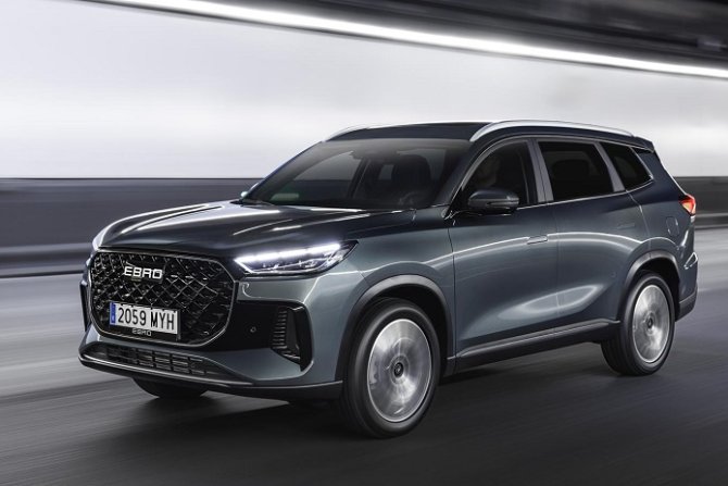 El nuevo SUV de Ebro cuenta con siete plazas de serie y el equipamiento más completo de la marca, con unas llantas de aleación de 19 pulgadas y portón trasero de apertura eléctrica en el exterior.