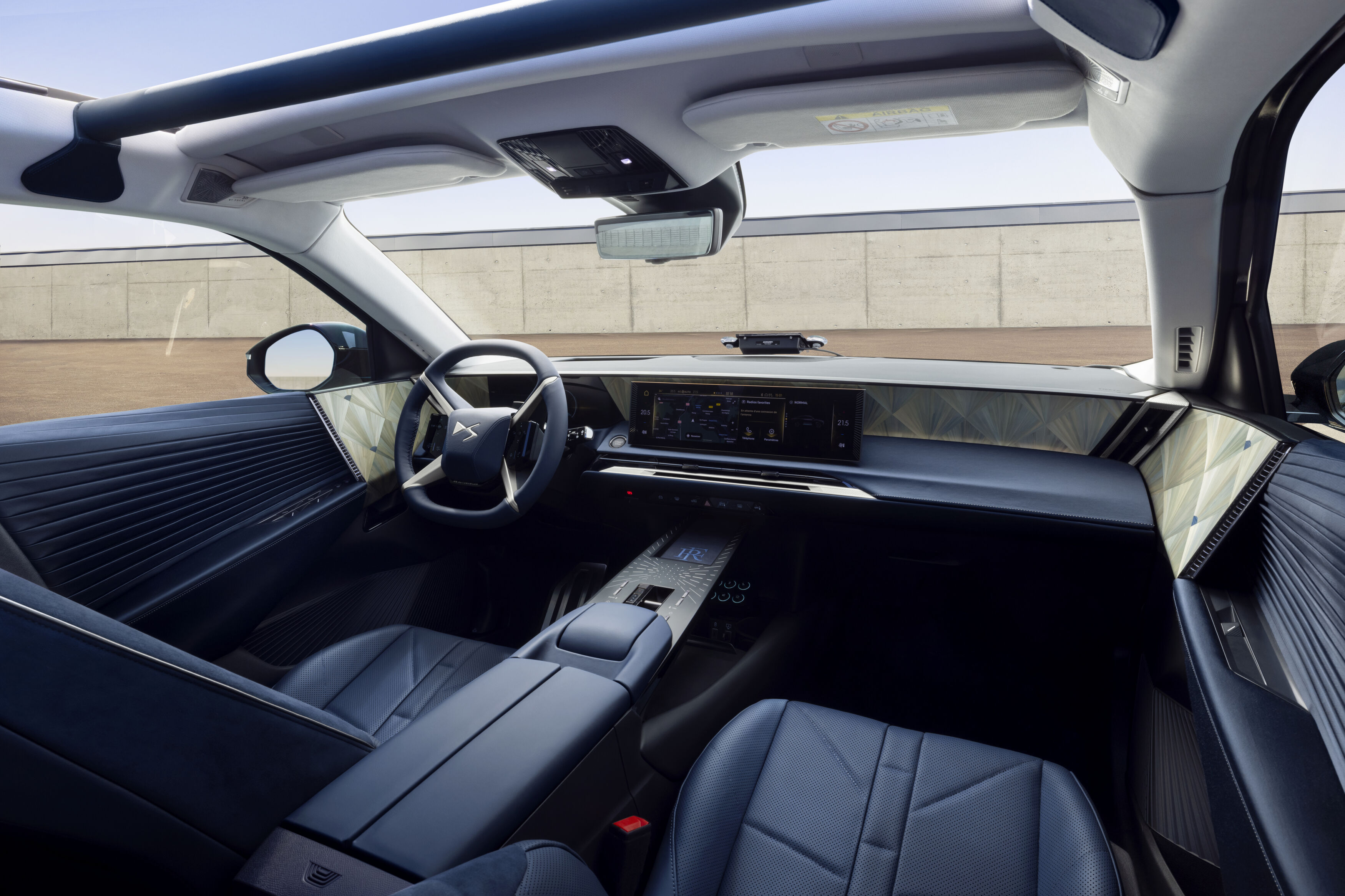 En el interior la marquetería de paja de la parte delantera del salpicadero, así como del embellecedor de la puerta delantera se combinan con los paneles de satén Dream Blue seleccionados para revestir al DS N°8 PRÉSIDENTIELLE confeccionados con tejidos de Verel de Belval y tejidos plisados del Atelier Lognon.