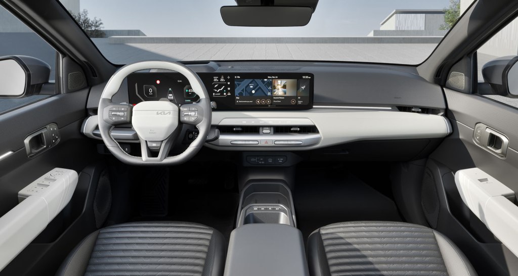 El habitáculo del EV4 representa una auténtica experiencia digital. KIA ha optado por un diseño vanguardista en el que dominan las tres pantallas (instrumentación, infoentretenimiento y climatización), con integración de apps como YouTube o Netflix para cuando el coche está cargando, además de videojuegos o karaoke. Todo bajo el concepto de “Vehicle Smart TV”.